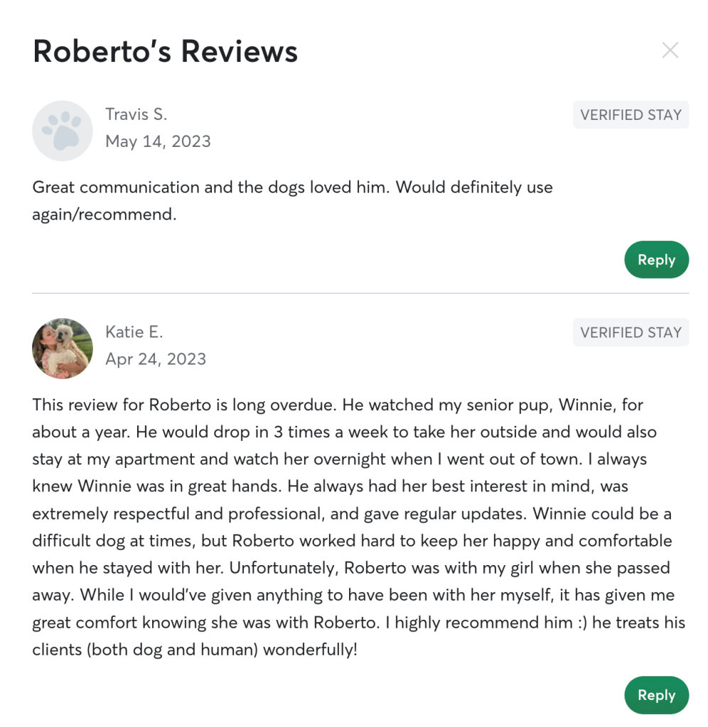 BIO I’ve been around dogs all my life since I was born (especially larger breeds.) My dog sitting/walking business has been around for 6 years with various clients in NY/PR/MIA. I’m a novel writer and editor. Meaning that I have lots of free time; especially for dog/apt sitting. My schedule is very flexible and I’m more than willing to stay in your residence most of the time to take care of your pet, and keep it company (no leaving your pet alone for long periods of time).