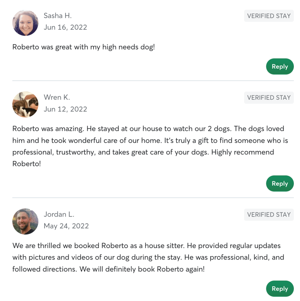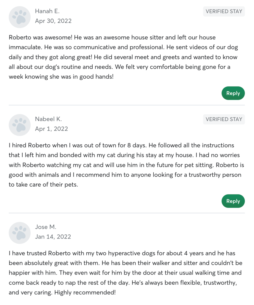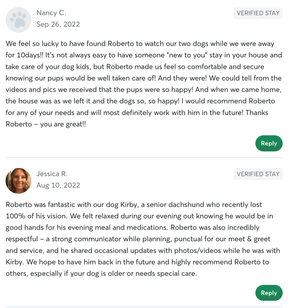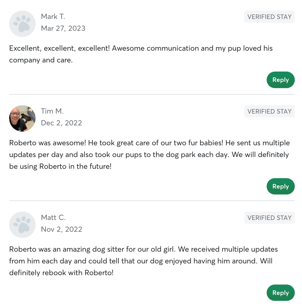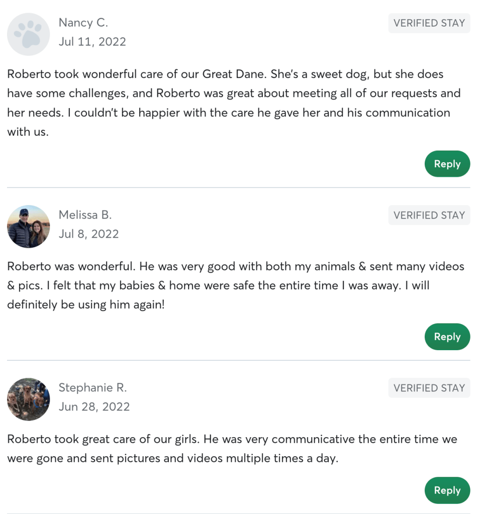 Day-to-Day We’ll maintain constant daily communication with texts, videos and pics confirming everything is great. Your house will be exactly as you left it. No surprises. And your pet will be in excellent hands. Please just let me know everything you need to give you peace of mind when leaving your pet with me. I will follow your instructions to the tee because I know how special your four-legged family is.